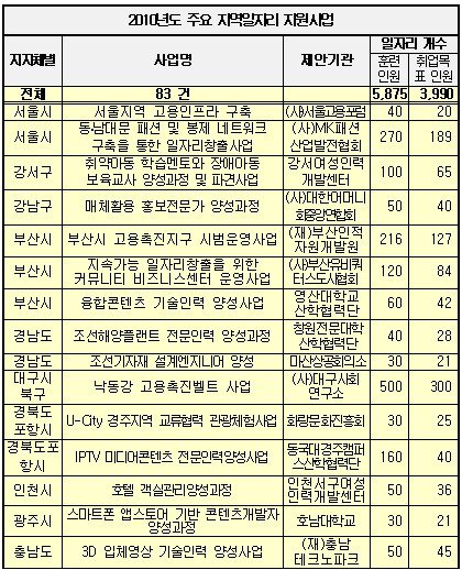 올해 83개 사업 가운데 부산광역시 고용촉진지구 시범운영사업, 광양만권 철강ㆍ조선산업 일자리창출 및 인적자원개발사업, 동·남대문 패션 및 봉제 네트워크 구축을 통한 일자리창출 사업 등 25건은 지난해에 이어 올해도 지원대상에 포함됐으며 전북 친환경부품소재일자리창출지원사업과 충남 3D입체영상 기술인력양성사업 등 58건은 신규로 지원받는다.