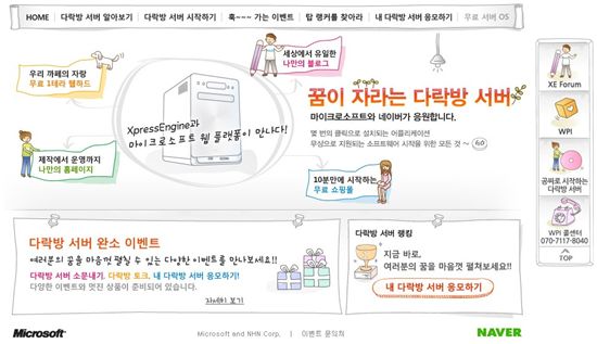 NHN(대표 김상헌)과 한국마이크로소프트(대표 김 제임스 우)는 17일 두 회사의 웹 플랫폼과 웹사이트 제작 소프트웨어를 활용해 오래 되거나 사양이 낮아 사용치 않는 '장롱 PC'를 서버로 활용할 수 있는 '다락방 서버(www.darakserver.com)' 사업에 나서기로 했다고 밝혔다.