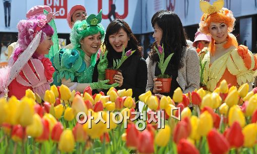 [아시아경제 이재문 기자] 에버랜드가 16일 오후 서울 코엑스 밀레니엄 광장에서 시민들에게 에버랜드에 피어있는 튤립 300구를 화분에 담아 증정하는 이벤트를 펼치고 있다. 에버랜드 튤립축제는 오는 19일부터 시작된다.