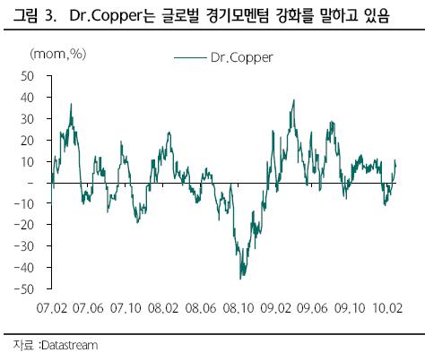 박정우 애널리스트는 "최근 칠레 지진이라는 변수가 있기는 하지만 구리가격 동향은 글로벌 경기 모멘텀이 강화되고 있는 국면이라는 것을 말해 준다"며 "중요한 점은 이러한 글로벌 경기모멘텀 강화를 미국이 주도하고 있다는 점"이라고 말했다.
