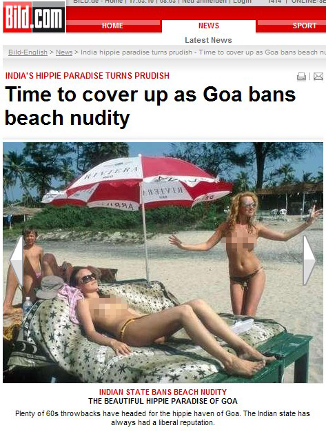 16일(현지시간) 독일 일간 빌트 온라인판에 따르면 인도의 유일한 ‘해방구’인 고아주는 해변 및 공공장소에서 전라뿐 아니라 토플리스 차림도 금했다.