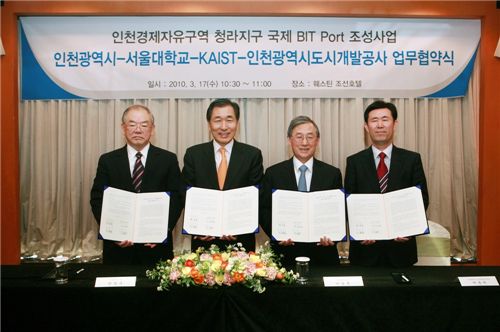 이날 안상수 인천시장과 이장무 서울대 총장, 서남표 카이스트 총장, 어윤덕 인천도개공 사장은 서울 조선호텔에서 만나 협약서에 서명하고 BT와 IT 융합기술분야의 교육ㆍ연구ㆍ산업화단지를 조성하는데 합의했다.