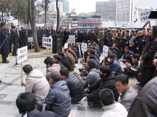 지난 17일 서울 중구 태평로 신한은행 본점 앞에서 월드건설 하청업체 직원들이 채권단에 대해 '자금지원'을 요구하며 시위를 벌였다.