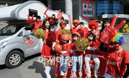 [아시아경제 이재문 기자] KT가 18일 오전 서울 용산역 광장에서 20일부터 1박2일간 캠핑카를 타고 프로농구 플레이오프 전 응원을 떠날 응원단 '올레건' 참가팀을 확정하고 원정응원에 사용할 캠핑카를 공개했다. 응원여행 참가자들이 응원복장으로 포즈를 취하고 있다.