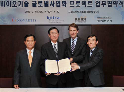 노바티스는 18일 서울 그랜드 하얏트호텔에서 코트라, 한국보건산업진흥원, 법무법인 충정 등과 함께 ‘바이오기술 글로벌사업화 프로젝트 (GATE II) 업무 협약식’을 체결하고 노바티스의 투자처 물색을 지원키로 합의했다.