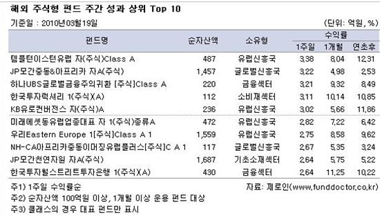 펀드별로는 템플턴이스턴유럽 자(주식)Class A 펀드가 3.38% 수익률로 주간성과 1위를 차지했고 JP모간중동&아프리카 자A(주식)펀드는 같은 기간 3.22% 상승했다.