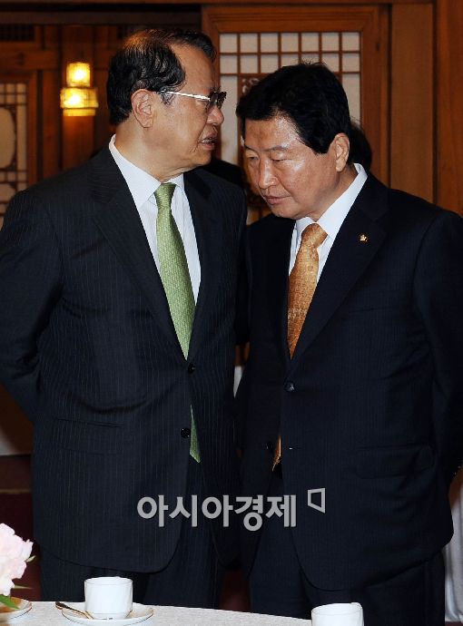 [아시아경제 이재문 기자] 22일 오전 서울 삼청동 총리공관에서 열린 고위당정협의회에서 정정길 대통령실장과 안상수 원내대표가 대화를 나누고 있다.