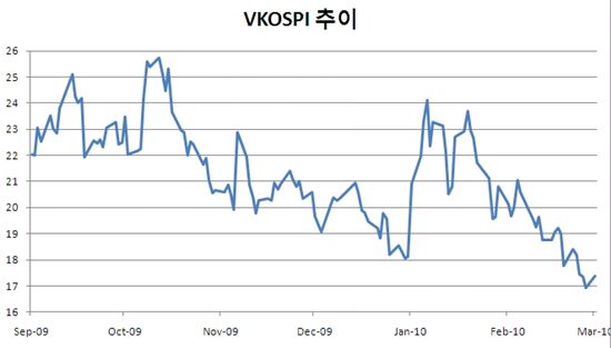 윤선일 동양종합금융증권 연구원은 "2006년에서 2007년 상반기까지 코스피 지수의 완만한 상승세가 이어지는 가운데 VKOSPI도 낮은 수준에서 장기간 횡보했던 적이 있다"며 "VKOSPI가 추세적인 하락세를 보이고 있다는 점은 지수 상승에 대한 신뢰가 아직은 유효하다고 해석할 수 있다"고 설명했다.