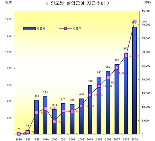 실업급여 지급자 수와 지급액은 2003년 36만여명, 8451억원에서 해마다 꾸준히 늘어 지난해에는 130만명에게 4조1164억원이 지급됐다. 이에 따라 고용보험 적림금도 줄어들기 시작했다. 2007년 고용보험료 수입은 2조6063억원이었으나, 실업급여(구직급여), 조기재취업수당, 산·전후휴가급여, 육아휴직급여 등의 지출은 2조7132억으로 적자기조로 돌아섰다. 특히 지난해에는 4조5279억을 지출한 반면 수입은 2조9897억원에 그쳐 고용보험적립금이 3조5284억원으로 축소됐다. 이는 전년의 5조667억원에서 무려 30%나 감소한 수치다.
