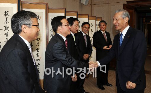 [아시아경제 이재문 기자] 이성태 한국은행 총재가 24일 오전 서울 소공동 한국은행 본점에서 임기 내 마지막 공식 대외일정인 경제동향 간담회를 주재, 주요 연구 기관 및 학계 인사들과 인사를 나누고 있다.