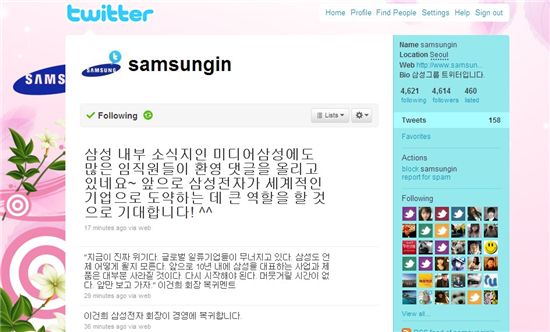 [아시아경제 명진규 기자]삼성그룹은 24일 이건희 회장 복귀와 관련, 공식 트위터를 통해 "삼성 내부 소식지인 미디어삼성에도 많은 임직원들이 환영 댓글을 올리고 있다"면서 "삼성전자가 세계적인 기업으로 도약하는데 큰 역할을 할 것으로 기대된다"고 밝혔다.