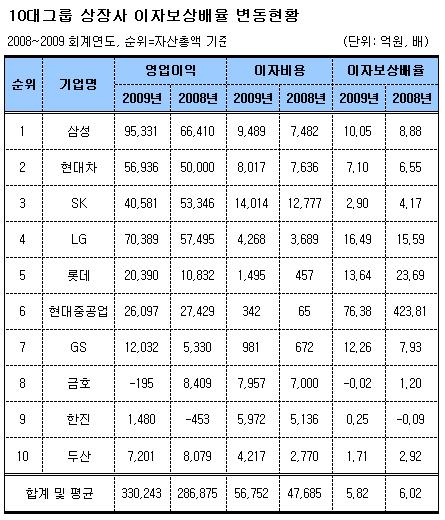 재벌닷컴은 24일 총수가 있는 자산순위 10대그룹 소속 82개 상장사(12월 결산법인)의 2009 회계연도 이자보상배율을 조사한 결과 평균 5.82배로 조사돼 2008년의 6.02배보다 낮아졌다고 밝혔다. 이자보상배율은 기업의 부채상환 능력을 나타내는 지표로 영업이익을 이자비용으로 나눈 것이며 1미만이면 이자지급 능력에 문제가 있다.