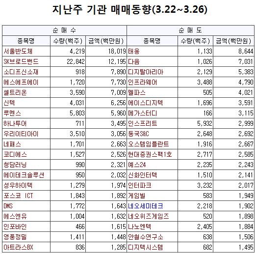28일 금융투자업계에 따르면 코스닥 시장에서 지난 한 주 동안(3.22~3.26) 개인과 외국인, 기관이 모두 순매수를 기록했다. 특히 기관은 퇴출에 대한 우려가 고조됐으나 일주일 내내 순매수를 지속해 눈길을 끌었다.