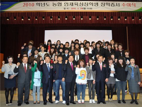 [아시아경제 이규성 기자]$pos="C";$title="";$txt="";$size="550,415,0";$no="2010033010574192389_1.jpg";@include $libDir . "/image_check.php";?>농협문화복지재단 최원병 이사장(농협회장)이 29일 농업인 자녀 5만1000명에게 404억원의 장학금을지급하는 장학증서를 수여하고 이기수 고려대 총장 등 주요 대학교 외빈들과 함장학증서를 전달한뒤 기념촬영을 하고 있다.맨 앞줄 오른쪽부터 양일선 연세대 부총장, 고려대 이기수 총장(4번째), 최원병 농협중앙회장(7번째), 서울대 김신복 부총장(9번째), 건국대 김우봉 부총장(11번째)