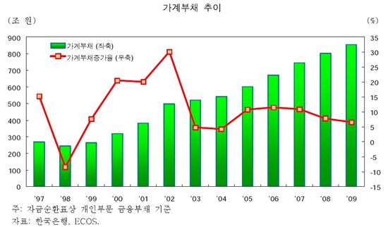 신창목 삼성경제연구소 수석연구원은 “지난해 말 현재 개인부문의 금융부채는 854조8000억원으로 2008년말 802조3000억원에 비해 6.5% 증가하는 등 지난 수년간 개인부문의 금융부채가 빠른 속도로 증가하고 있다”고 설명했다. 그는 “특히 지난 수년간 가계부채가 명목 개인처분가능소득보다 빠르게 증가하고 있어서 채무상환능력에 대한 우려가 제기되고 있다”고 주장했다.