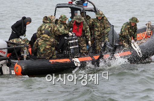 [아시아경제 이재문 기자] 30일 오전 천안함이 침몰한 백령도 사고 해역에서 해군 SSU 잠수 요원들이 선미의 위치가 표시된 부표 주위에서 실종자를 수색하고 있다.