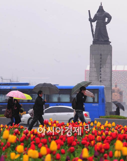 [아시아경제 윤동주 기자] 3월 마지막날 봄을 재촉하는 봄비가 내린 31일 서울 세종로 사거리에 조성된 튤립 사이로 우산을 쓴 시민들이 지나가고 있다.