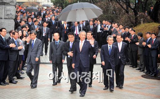 이성태가 한은 총재가 마지막으로 자신의 차량에 탑승하기전 직원들을 향해 손을 흔들고 있다.