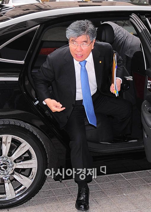 [아시아경제 윤동주 기자] 김중수 한국은행 신임총재가 1일 오전 서울 중구 남대문로 한국은행 본관으로 첫 출근 하고 있다.