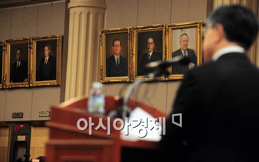 [아시아경제 윤동주 기자] 김중수 한국은행 신임총재가 1일 오전 서울 중구 남대문로 한국은행에서 열린 취임식에서 취임사를 하고 있다.