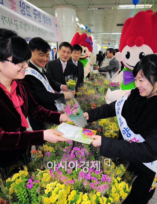 [아시아경제 윤동주 기자] 서울도시철도와 고양시는 대중교통 이용률을 높이고, 고양꽃 박람회를 홍보하기 위해 1일 오전 서울 광화문 지하철역사내에서 지하철을 이용하는 시민들에게 꽃을 나눠주는 행사를 갖고 있다.