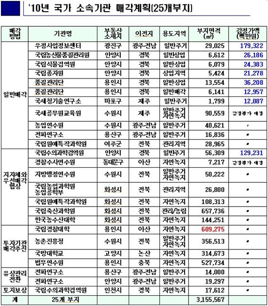 또 지방자치단체가 공원·교육시설 등 공공목적으로 사용하기 위해 매입을 희망하는 지방행정연수원(수원 소재) 등 7개 부지는 지방자치단체와 우선 매각협상이 진행된다.