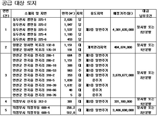 4억원 규모 양평군 복포리 토지(2필지, 1342㎡)는 이미 조성된 전원주택 단지 내로 한강조망이 가능하다. 동두천시(5필지, 7743㎡, 약 43억원)와 연천군(9필지, 7003㎡, 약 36억원) 토지는 공동주택단지로 전망이 좋다.
