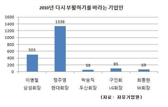 자유기업원은 최근 기업원이 후원하는 대학시장 경제강좌를 수강하는 전국 20개 대학 2119명을 대상으로 실시한 설문조사에서 ‘2010년 부활을 바라는 기업인은 누구인가’를 묻는 질문에서 항목에서 64.8%(1336명)가 고 정 명예회장을 선택했다고 5일 밝혔다.