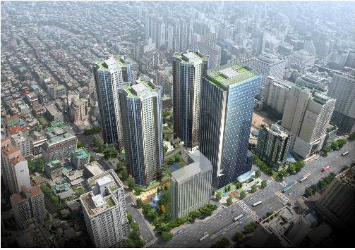 이에 따라 이 일대(대지면적 2만3655㎡)는 건폐율 56.57%, 용적률 829.57%가 적용돼 지하 4~5층, 지상 35~41층(연면적 28만1858㎡) 규모의 주상복합 건물 3개동이 건립된다. 이 곳에는 공동주택 916가구와 함께 업무시설 및 근린생활시설이 들어선다.