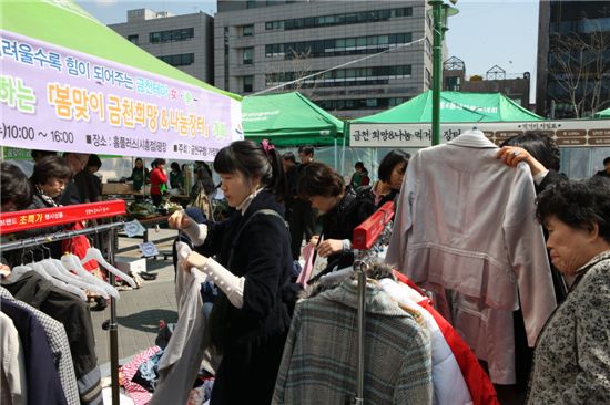 [아시아경제 박종일 기자]금천구(구청장 한인수)는 7일 10시부터 홈플러스 시흥점에서 '봄맞이 금천희망&나눔 장터'를 열었다.이날 장터를 위해 금천구 공직자 1000여명이 참여해 1인 1품목이상 물품을 기증했다. 물품판매 수익금은 전액 다문화 가정을 위해 사용할 예정이다. 알뜰 장터에서 물건을 유심히 고르며 지켜보고 있는 주민의 모습.