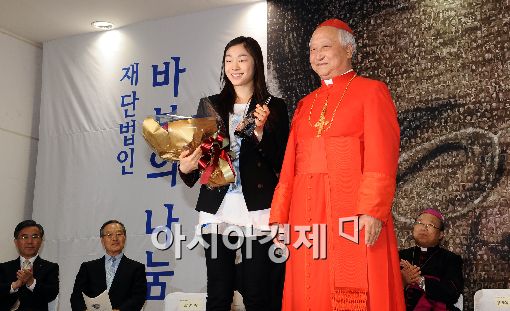 [아시아경제 이재문 기자] 피겨여왕 김연아가 7일 오후 서울 명동성당에서 열린 재단법인 '바보의 나눔' 창립식에 참석해 홍보대사 위촉패를 받은 뒤 정진석 추기경과 함께 기념촬영을 하고 있다.