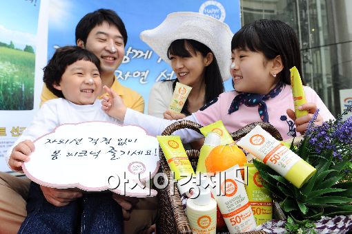 [아시아경제 이재문 기자] 아모레퍼시픽 토탈 바디케어 전문 브랜드 해피바스가 8일 오전 서울 세종로 사거리에서 유기농 성분으로 자극을 최소화한 자외선차단제 '선케어 라인' 7종을 선보이고 있다.