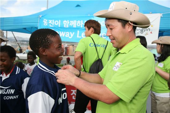 취업 연령의 24.5% 정도가 실업자인 남아프리카공화국. 웅진코웨이는 2006년부터 남아공 케이프타운 아산다 지역의 청소년 축구팀을 후원해 오고 있다. 웅진 리그라는 타이틀로 매년 15개 팀이 참가해 토너먼트를 진행하고 그 중 4개 팀에는 축구공, 유니폼 등 각종 축구 관련 용품과 학비를 지원해 주고 있다. 청소년들에게 스포츠를 통해 새로운 희망과 기회를 심어주고 있는 것이다.