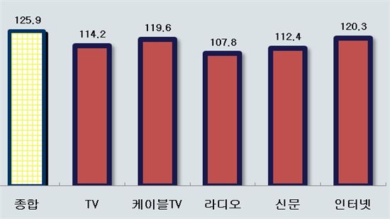 매체별로는 ▲TV 114.2 ▲신문 112.4 ▲케이블TV 119.6 ▲인터넷 120.3 등으로 모든 매체의 광고비가 4월보다 5월에 증가할 것으로 기대되며, 인터넷이 상대적으로 강세를 보일 것이로 보인다.