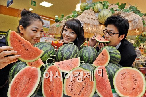 [아시아경제 이재문 기자] 롯데마트가 9일 오전 서울역점에 경남 함안, 의령 등지에서 생산된 수박을 선보여 고객들의 눈길을 끌고 있다. 14일까지 선보이는 수박은 비파괴 당도 선별 검사를 통해 농산물표준기준인 9Brix보다 당도가 높으며 시세보다 약 40% 저렴한 9900원에 판매된다.