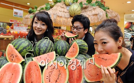 [아시아경제 이재문 기자] 롯데마트가 9일 오전 서울역점에 경남 함안, 의령 등지에서 생산된 수박을 선보여 고객들의 눈길을 끌고 있다. 14일까지 선보이는 수박은 비파괴 당도 선별 검사를 통해 농산물표준기준인 9Brix보다 당도가 높으며 시세보다 약 40% 저렴한 9천900원에 판매된다.