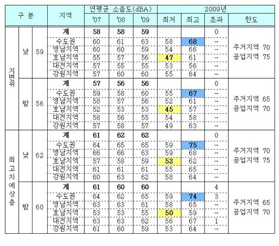 10일 환경부에 따르면 지난해 전국 5개 권역의 34개 지점(수도권8 영남9 호남8 대전5 강원4)에서 철도소음을 측정한 결과, 소음도가 가장 높은 지점은 열차운행대수가 가장 많고 고가도로 등 주변소음원이 많은 영등포 센터프러스 지점이었다.