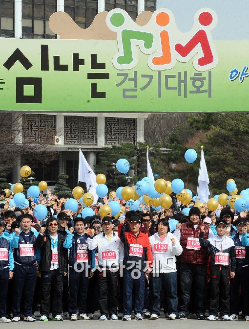 [아시아경제 이재문 기자] 11일 오전 서울 송파구 올림픽공원에서 열린 '정관장과 함께하는 심나는 걷기대회'에서 참가자들이 출발 전 화이팅을 외치고 있다.