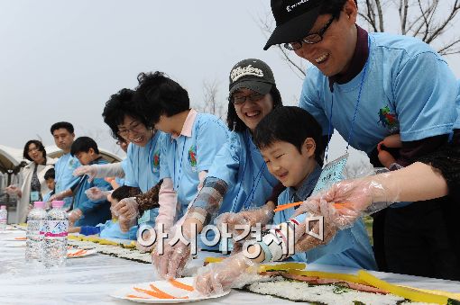 [아시아경제 이재문 기자] 11일 서울 한강시민공원 잠원지구에서 열린 세계 혈우인의 날 기념행사에서 참가자들이 36.5m 사랑의 김밥을 만들고 있다.