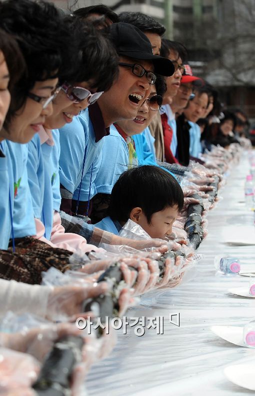 [아시아경제 이재문 기자] 11일 서울 한강시민공원 잠원지구에서 열린 세계 혈우인의 날 기념행사에서 참가자들이 36.5m 사랑의 김밥을 만들고 있다.