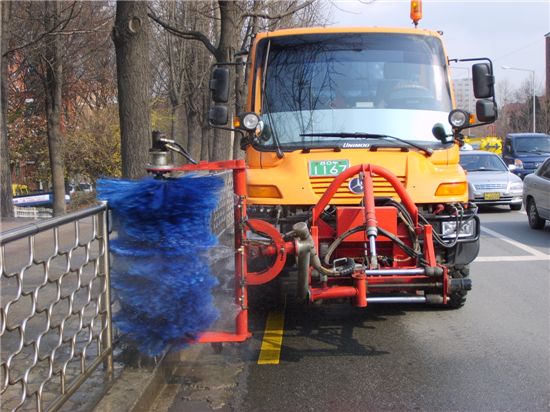활용 방식은 간단하다. 차량 앞 쪽에 부착했던 제설 삽날을 떼어낸 자리에 먼지를 씻어낼 브러시(청소용 솔)를 단 뒤 물탱크를 실으면 된다.