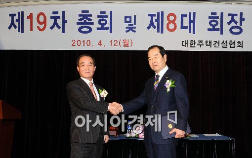[아시아경제 이재문 기자] 12일 서울 여의도 63빌딩에서 열린 대한 주택건설협회 제 19차 총회 및 제8대 회장 취임식에서 김충재 신임회장이 박성래 선거위원장에게 임명장을 받고 있다.