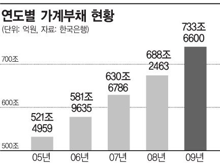 지난해 말 현재 우리나라의 가계부채 총액은 733조원으로 사상 최고치다. 이를 개인부채로 환산하면 1인당 1754만원의 빚을 지고 있는 것으로 관련 통계가 집계된 1975년 이후 처음으로 1인당 국민총소득(2192만원)의 80%대를 돌파했다.