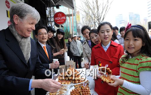 [아시아경제 이재문 기자] 피에르 클레망 뒤뷔송 주한 벨기에 대사가 13일 서울 할리스커피 태평로점에서 시민들에게 벨기에 정통 와플과 핫초코를 무료로 나눠주고 있다. 국내 토종 커피 전문 브랜드 할리스커피는 초콜릿과 와플의 나라 벨기에 문화 전시회 오픈을 기념해 이번 이벤트를 진행했다.