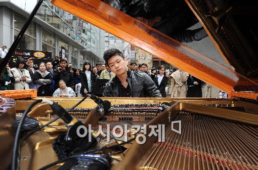 [아시아경제 이재문 기자] 현대캐피탈이 14일 오후 서울 명동거리에서 새로운 형식의 클래식 문화 공연인 ‘Stop & Listen'을 선보이고 있다. 이날 거리를 지나던 시민들이 멈춰서 천재 피아니스트 지용의 공연을 귀 기울이고 있다.