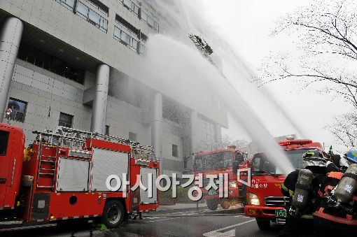 [아시아경제 이재문 기자] 14일 오후 서울 연세의료원에서 열린 2010년도 재난대비 긴급구조종합훈련에서 서대문 소방서 소방대원들과 유관기관 관계자들이 테러폭발 및 대형화재 발생 상황을 모의훈련하고 있다.