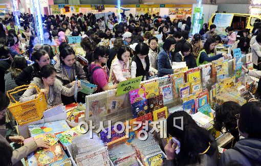 [아시아경제 이재문 기자] 15일 서울 삼성동 코엑스에서 열린 '제22회 서울 국제유아교육전'을 찾은 임산부 및 영유아 학부모들이 할인 학습교재를 살펴보고 있다.