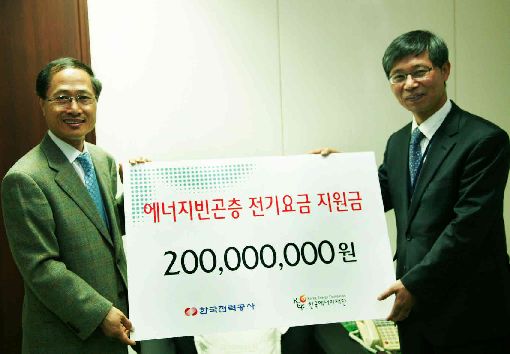 $pos="C";$title="한전";$txt="박래용 한전 홍보실장(왼쪽)이 김기준 한국에너지재단 이사장에게 2억원의 기증서를 전달하고 있다";$size="510,354,0";$no="201004151430134262451A_1.jpg";@include $libDir . "/image_check.php";?> [아시아경제 이경호 기자] 한국전력(사장 김쌍수)은 15일 서울 삼성동 본사 회의실에서 전기 요금을 제때 납부하지 못하는 최극빈층을 지원하기 위해 한국에너지재단(이사장 김기춘)과 전기요금 지원 협약을 체결하고 2억원을 전달했다고 밝혔다.