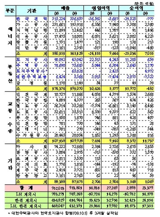 지난해 경영실적을 부문별로 살펴보면 에너지공기업의 전체 매출액은 56조5000억원으로 전년대비 1조5000억원 감소했으나, 순이익은 7000억원으로 2008년 순손실 -2조5000억원에서 흑자(3조2000억원 증가)로 전환했다.