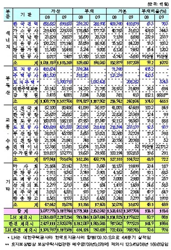재정부에 따르면 지난해 23개 공기업의 총 자산은 352조원, 총부채는 213조2000억원으로 2008년보다 각각 42조2000억원(13.6%), 36조1000억원(20.4%) 증가했다.